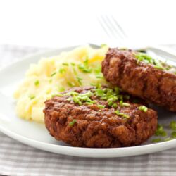 Frikadellen mit Sellerie-Kartoffelpüree und glasierten Minikarotten