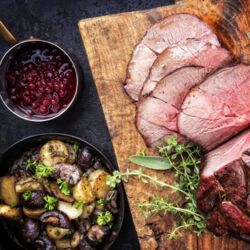 Glasierte Rote Bete mit Rehkeulensteak, Sahnerosenkohl begleitet Wildschwein an wilden Saucen.