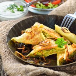 Gebratene Maultaschen mit Kräutersoße und gebratenem Gemüse