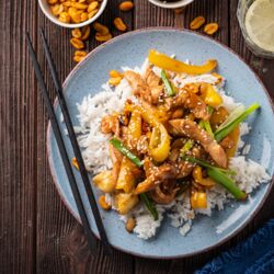 Asiatische Reispfanne mit Putenbruststreifen und Kokos-Curry-Sauce
