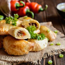 Empanadas mit Naturjoghurt, selbstgemachter Salsasauce und Salat