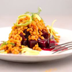 Rote Bete-Linsensalat, Tomatenrisotto mit Pinienkernen und Steak (300g), Panna cotta