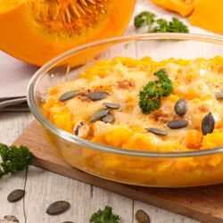 Kürbisauflauf mit überbackenem Ziegenkäse und Feldsalat