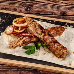 Adanan mit Gurken-Tomaten-Salat, Schafskäse, Acili Ezme und Joghurtdip mit Fladenbrot