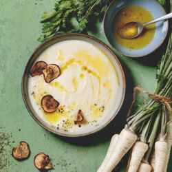 Petersilienwurzelsuppe mit Erdnussöl-Pesto
