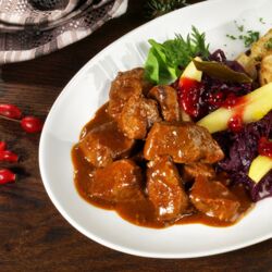 Wildschweingulasch, Mohnspätzle, Preiselbeerbirne